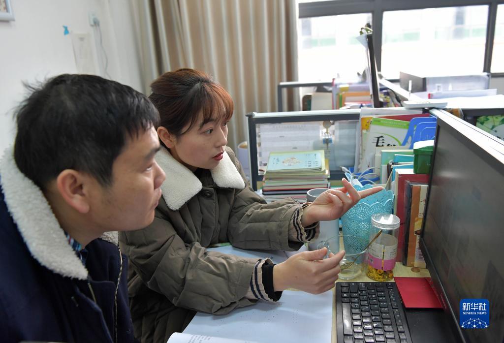 在江西省宜春市特殊教育學(xué)校,樊海艷在辦公室和同事一起商量如何編排學(xué)生們的舞蹈(12月28日攝)。