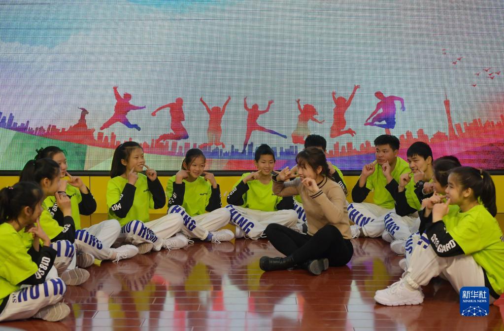 在江西省宜春市特殊教育學(xué)校,樊海艷和聽(tīng)障學(xué)生們一起用手語(yǔ)交流、排練舞蹈(12月28日攝)。