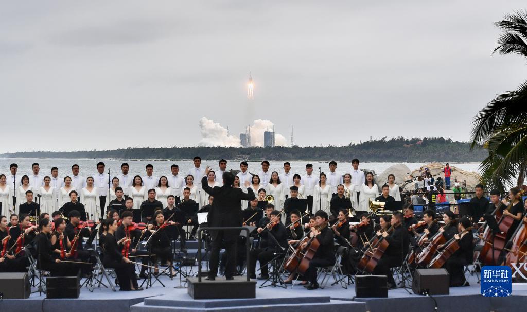 2021年4月29日11時(shí)23分,中國空間站天和核心艙在我國文昌航天發(fā)射場(chǎng)發(fā)射升空,準確進(jìn)入預定軌道,任務(wù)取得成功。這是西安交響樂(lè )團在發(fā)射現場(chǎng)周邊海灘演奏。