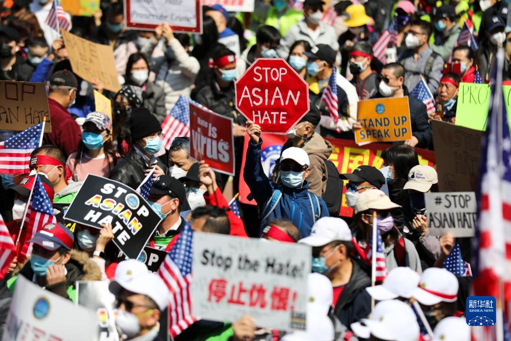2021年4月4日,人們在美國紐約參加游行反對亞裔仇恨。新冠疫情在美暴發(fā)以來(lái),美國針對亞裔的歧視、騷擾和暴力事件不斷增加。
