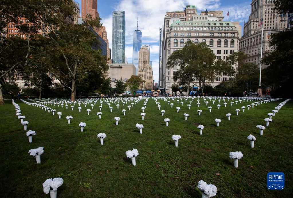 2021年10月8日,悼念槍支暴力遇難者的白色瓶花擺放在美國紐約炮臺公園的草坪上?,F場(chǎng)的1050個(gè)白色瓶花旨在悼念2020年在紐約州死于槍支暴力的1050名受害者。