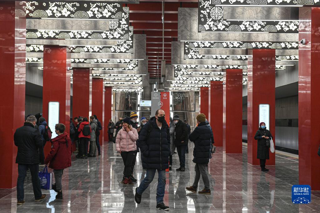 2021年12月7日,乘客走在俄羅斯首都莫斯科地鐵第三換乘環(huán)線(xiàn)西南段的米丘林大街站內。莫斯科地鐵第三換乘環(huán)線(xiàn)西南段由中國鐵建中標建設,其中的米丘林大街地鐵站由紅色立柱、團壽紋、祥云等中國元素裝飾,成為中俄友誼的新地標。