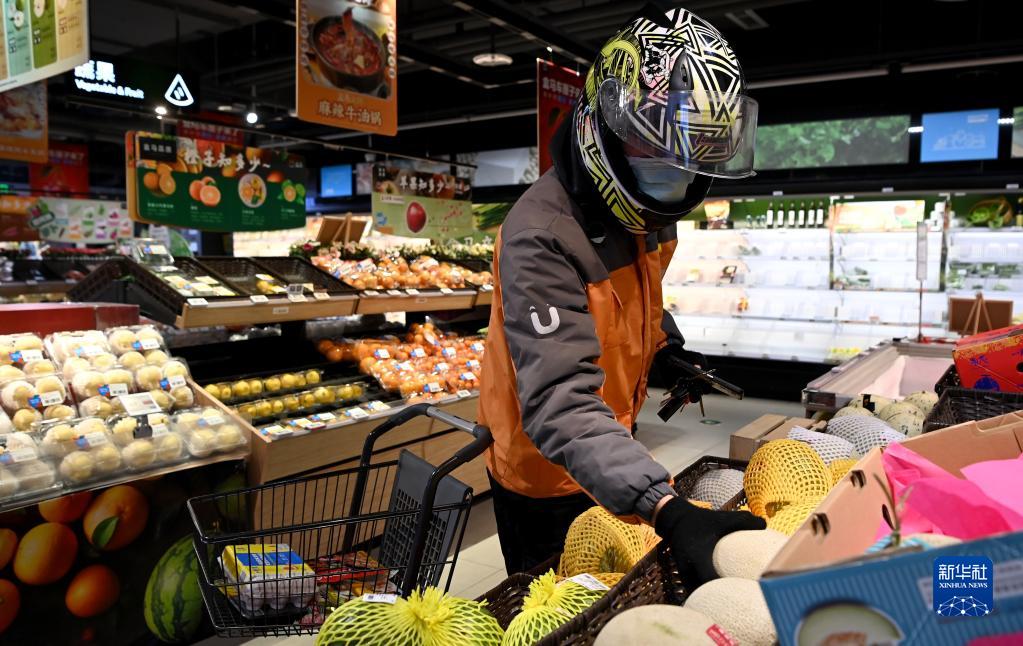 1月11日,一名配送員在西安市碑林區一家生鮮店為顧客選購食品。