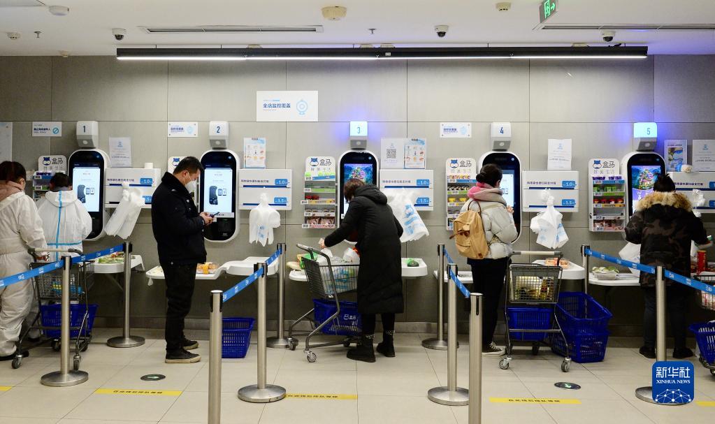 1月11日,市民在西安市碑林區南稍門(mén)一家生鮮店自助結賬。