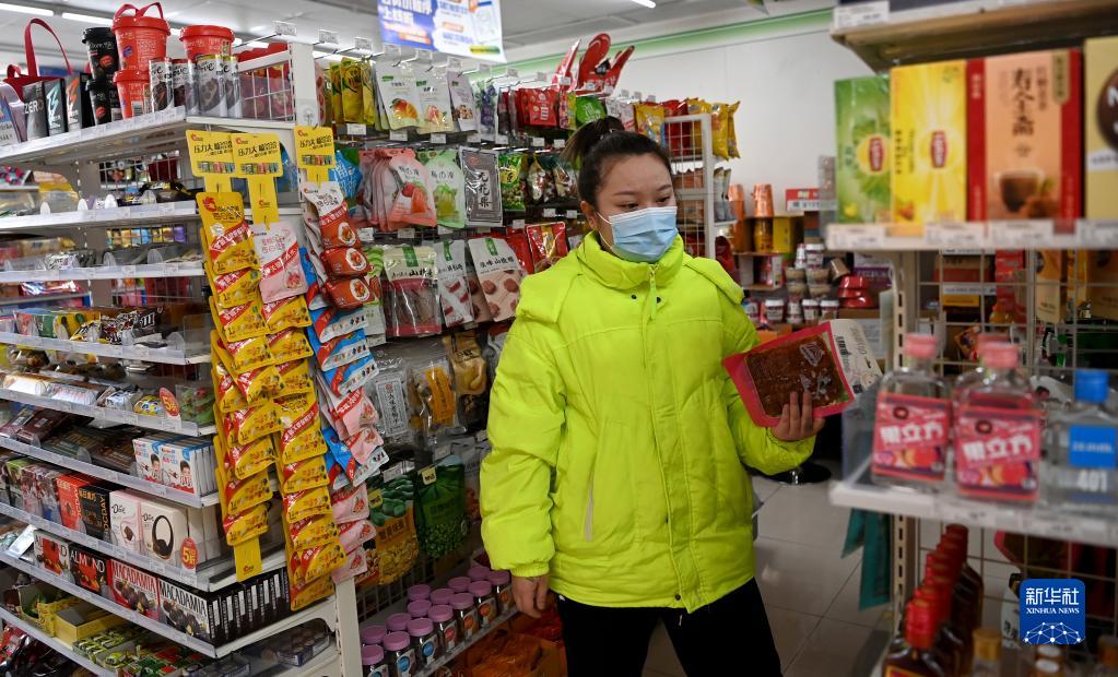 1月11日,西安市碑林區南稍門(mén)一家便利店內,市民在進(jìn)行選購。店內要求同時(shí)購物人數不能超過(guò)5人。
