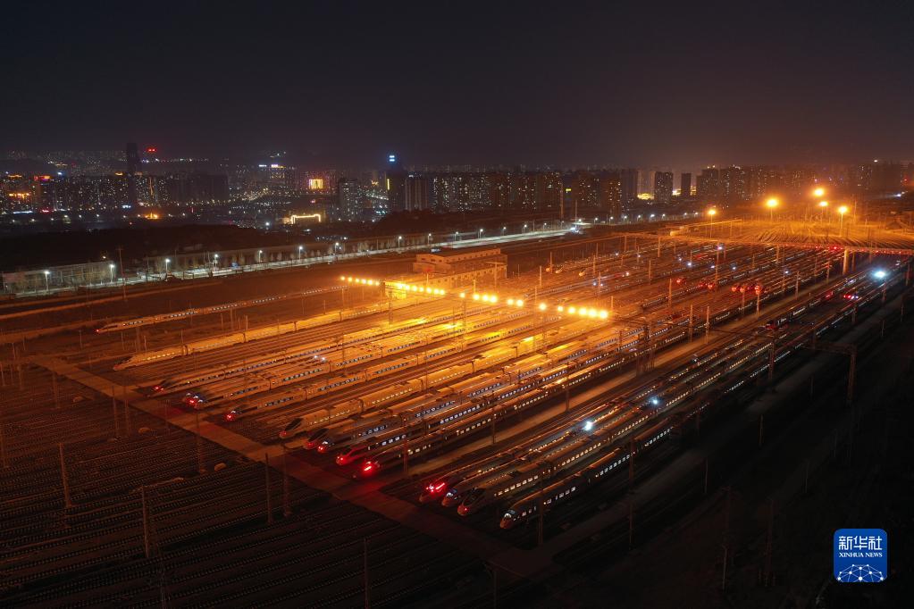 1月16日晚,動(dòng)車(chē)組列車(chē)??吭谥袊F路蘭州局集團有限公司蘭州車(chē)輛段蘭州西動(dòng)車(chē)運用所整備場(chǎng)上,為即將開(kāi)始的2022年春運做好準備(無(wú)人機照片)。