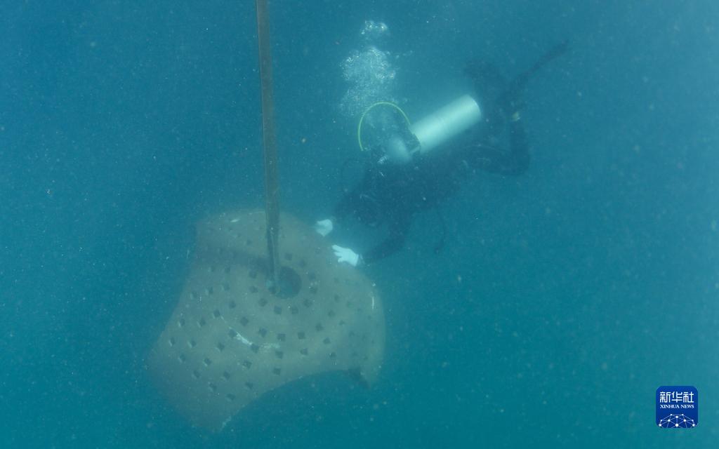 在亞龍灣相關(guān)海域,潛水員將人工生態(tài)礁移至海底指定區域(1月19日攝)。