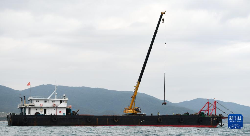 在亞龍灣相關(guān)海域,船上機械將人工生態(tài)礁吊入海中(1月19日攝)。