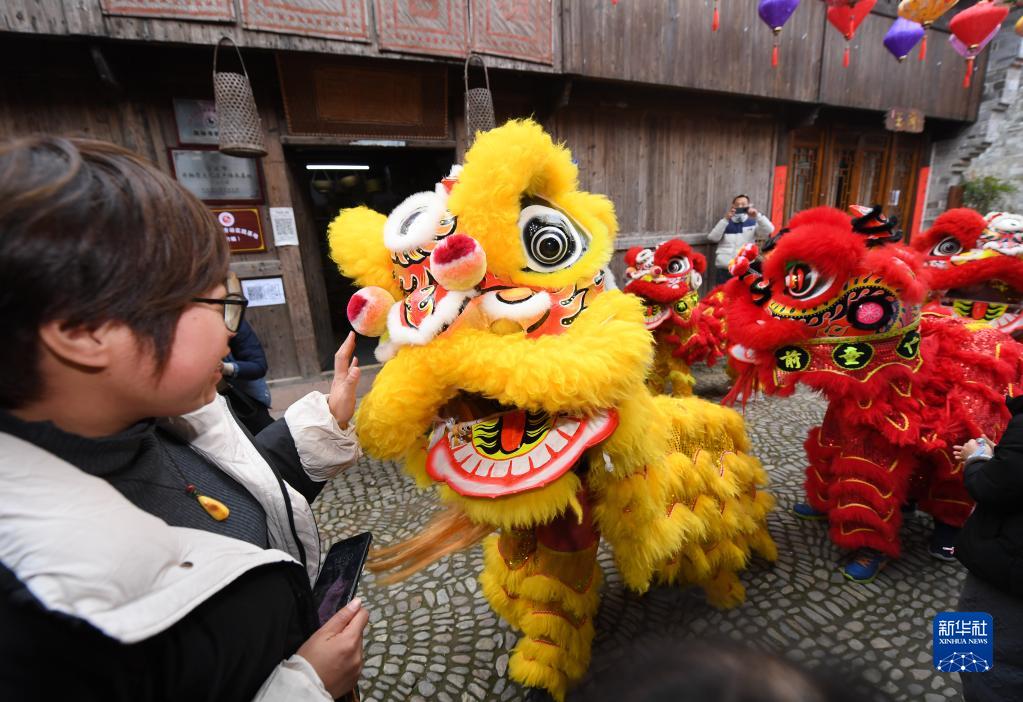 1月20日,在前童古鎮老街上,正在訓練的舞獅隊和游客互動(dòng)。