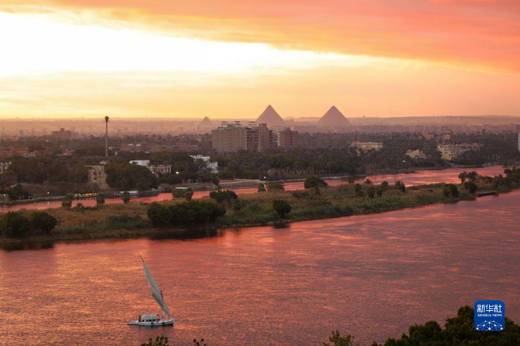 1月26日,一艘帆船行駛在埃及開(kāi)羅被霞光映紅的尼羅河上。