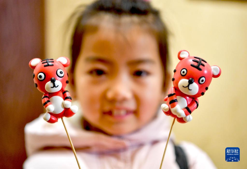 1月18日,在安徽省亳州市花戲樓景區國藝面塑館,一名小朋友展示剛捏制好的“萌虎”面塑。