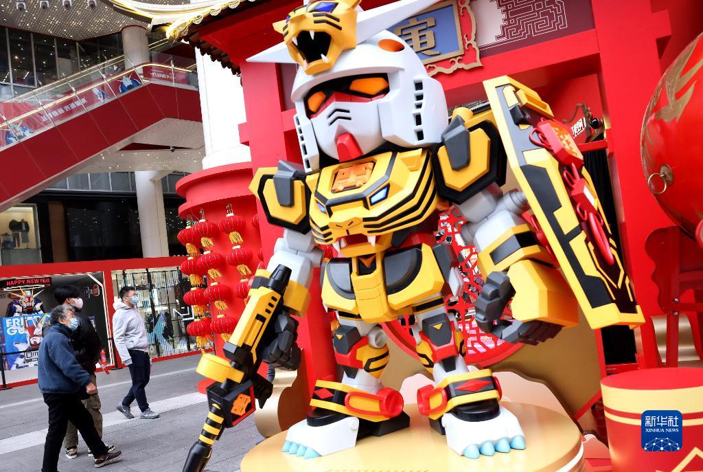 1月24日,游人在上海街頭觀(guān)看十二生肖虎的卡通裝置。