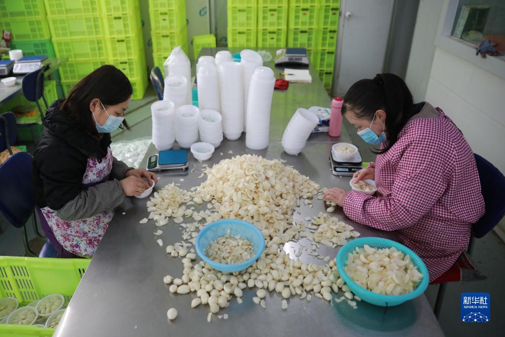 在蘭州市七里河區西果園鎮袁家灣村百合加工車(chē)間,村民孫曉英(右)和許海燕在分揀百合(1月26日攝)。