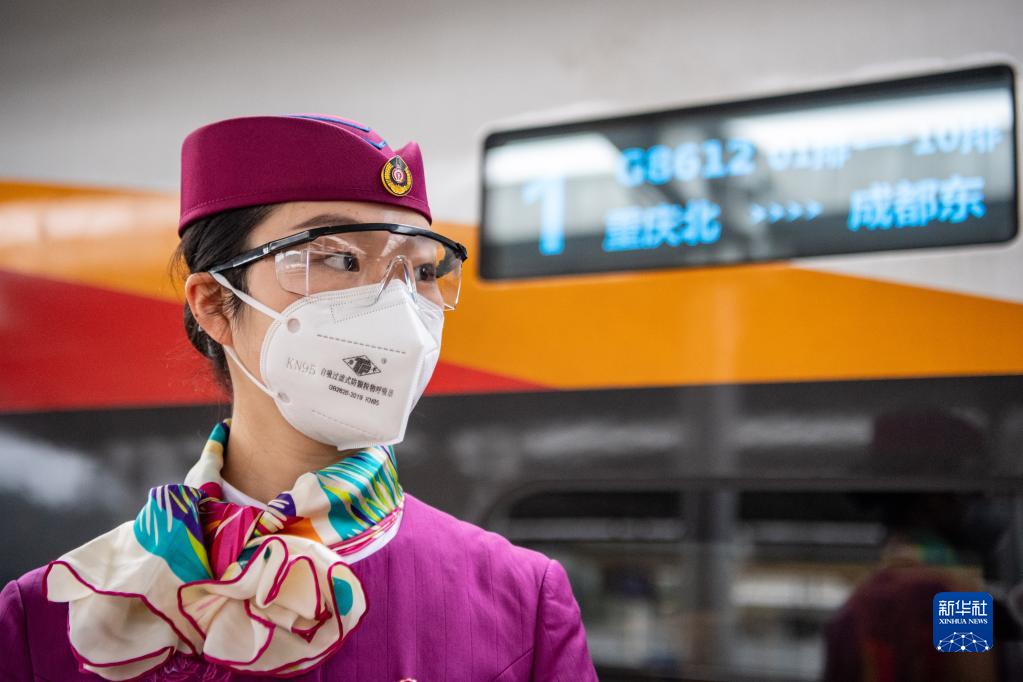 2月2日,在重慶北站,林夢(mèng)凡在智能復興號“共青團號”列車(chē)發(fā)車(chē)前做準備工作。