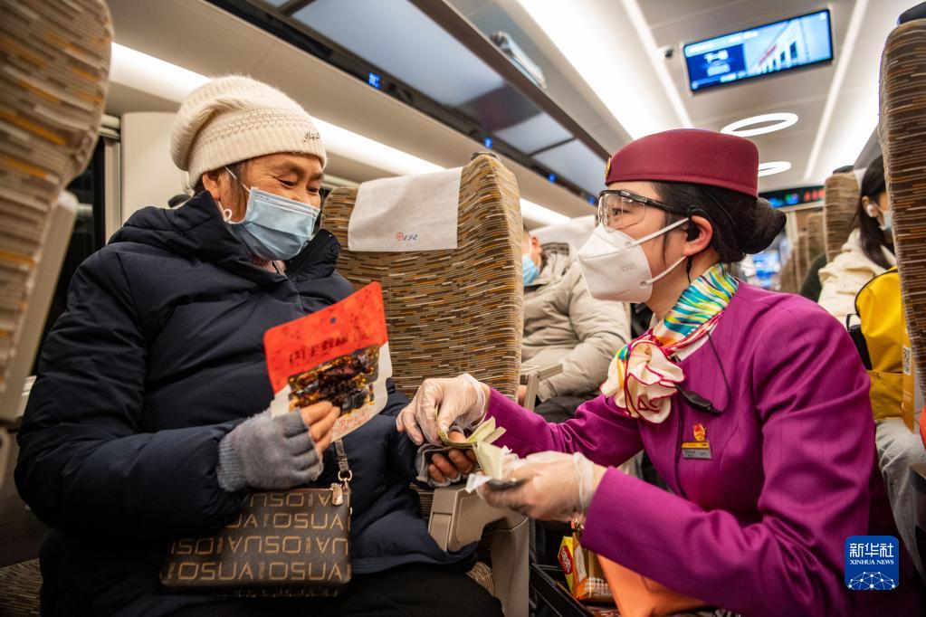 林夢(mèng)凡(右)在成渝高鐵智能復興號“共青團號”列車(chē)上為購買(mǎi)小食品的老年旅客提供零鈔找現服務(wù)(1月27日攝)。