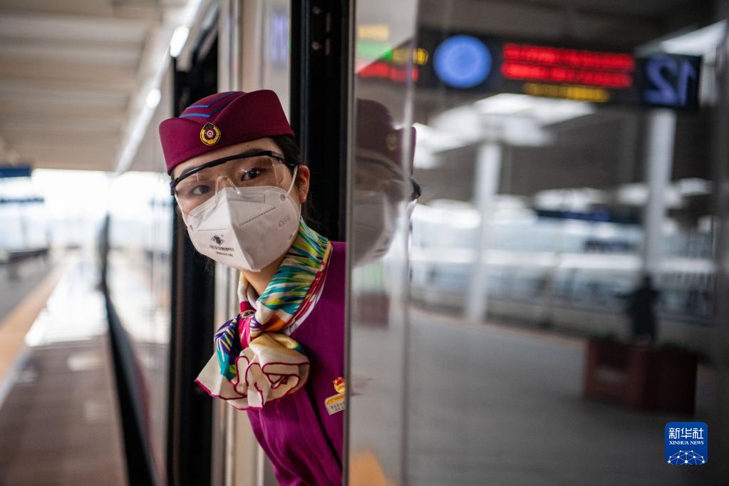 2月2日,在重慶北站,林夢(mèng)凡在智能復興號“共青團號”列車(chē)發(fā)車(chē)前做準備工作。