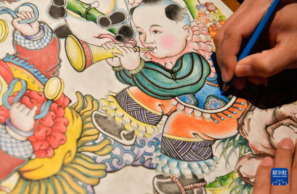 2月10日,天津楊柳青畫(huà)社青年傳承人在為其創(chuàng )作的年畫(huà)作品進(jìn)行彩繪。