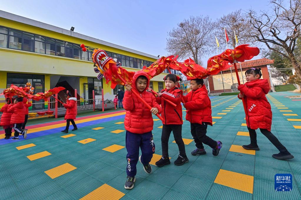 2月15日,山東省青州市一幼兒園的小朋友在舞龍。
