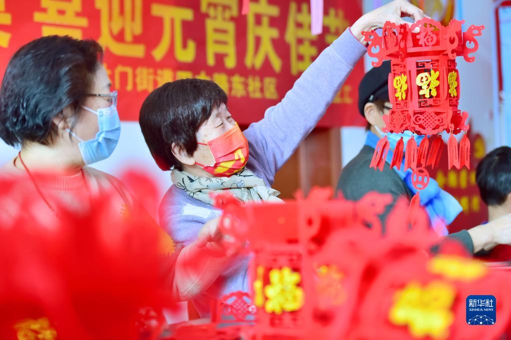 2月14日,在河北省石家莊市橋西區休門(mén)街道四中路東社區,社區居民一起制作“?!弊只?。