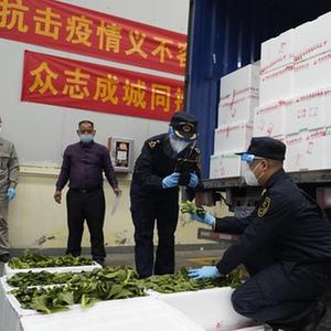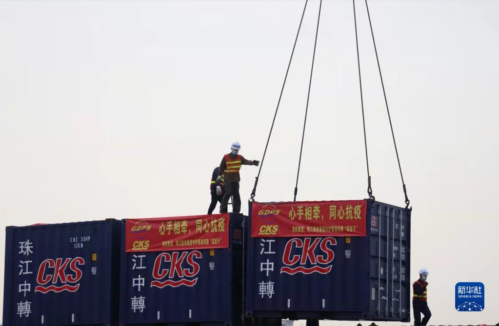 2月18日,工人把供港蔬菜的貨箱裝載到輪船上。新華社發(fā)