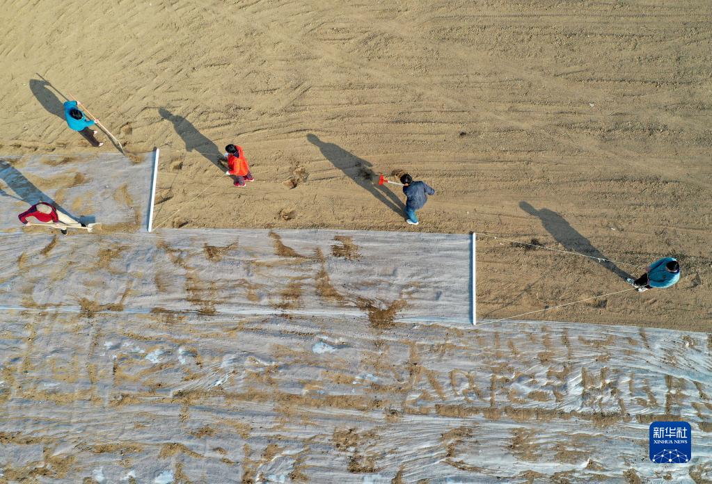 2月21日,在安徽省亳州市譙城區十河鎮位李村,村民為種植的中藥材覆蓋地膜(無(wú)人機照片)。