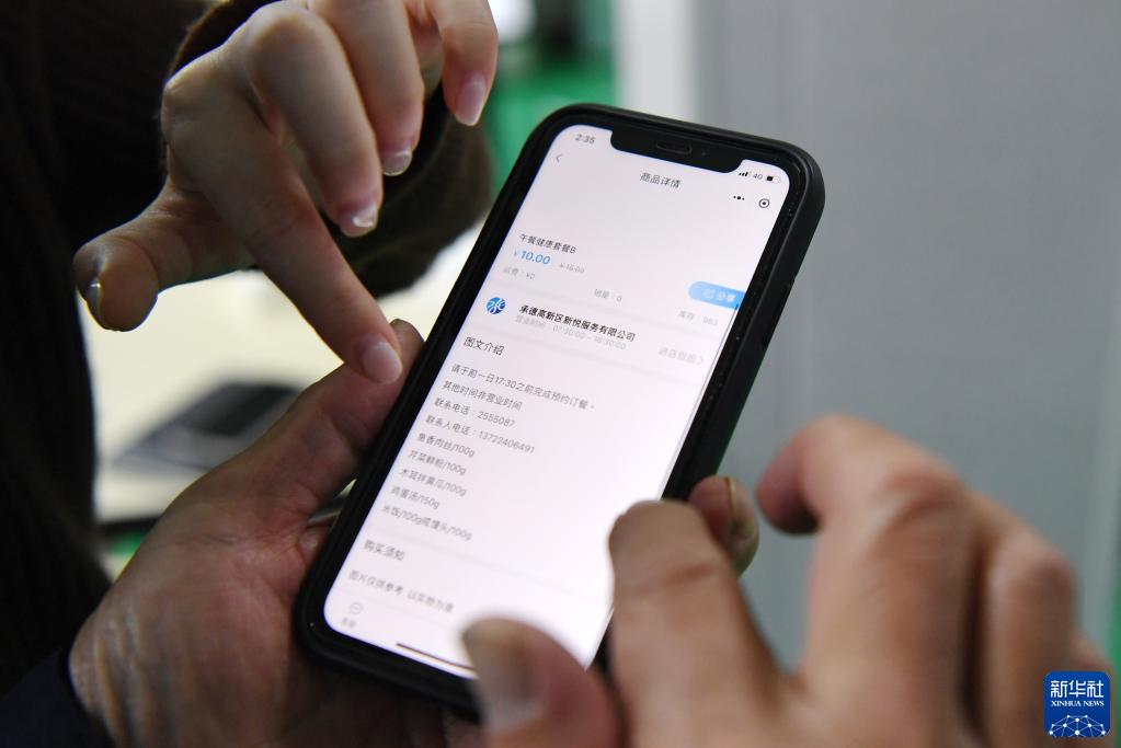 河北省承德市濱河社區老人通過(guò)手機智慧點(diǎn)餐系統訂餐(2021年12月15日攝)。