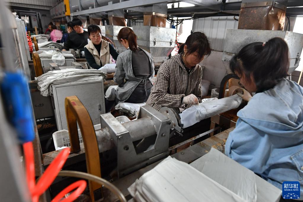 2月23日,工作人員在萬(wàn)榮縣香菇產(chǎn)業(yè)園內加工菌棒。
