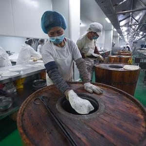 2月24日,在杭州市淳安縣臨岐鎮秋念餅業(yè)工廠(chǎng),工人在用傳統烘烤桶烘制當地特色美食——梅干菜餅。