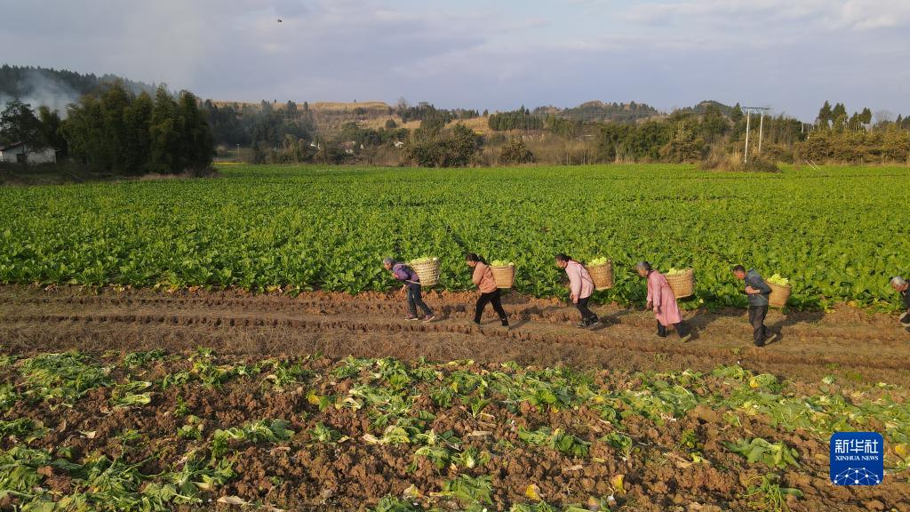 2月23日,四川省南充市嘉陵區李渡鎮蔡家壩村300畝榨菜豐收,村民轉運新鮮榨菜,準備運往市場(chǎng)(無(wú)人機照片)。