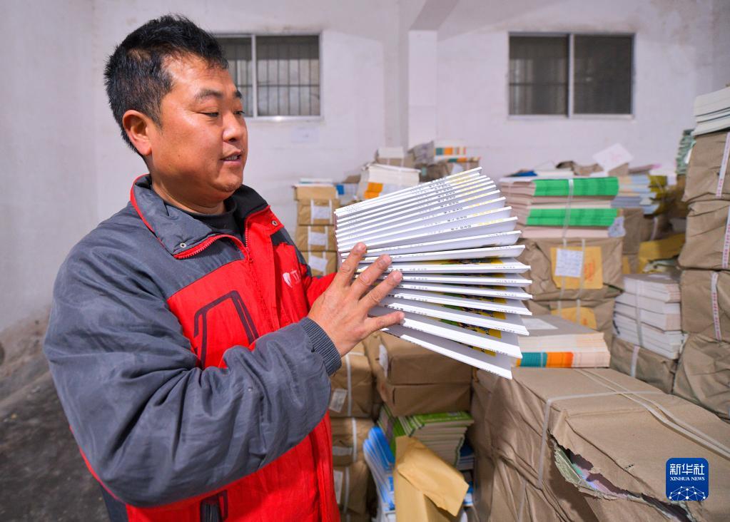 2月26日,在貴州省遵義市余慶縣,書(shū)店工作人員在分類(lèi)整理教材。