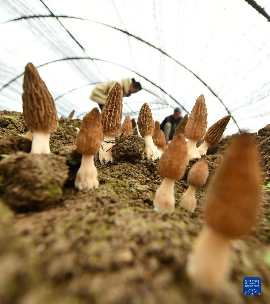 2月26日,在貴州省遵義市一現代農業(yè)產(chǎn)業(yè)園區,村民在大棚里采收羊肚菌。