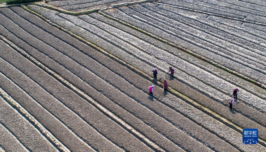 2月27日,湖南省懷化市通道侗族自治縣菁蕪洲鎮江口村村民在整理田地(無(wú)人機照片)。