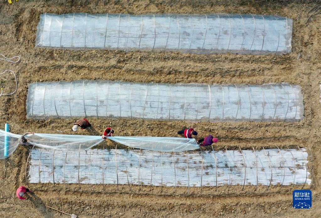 2月28日,在安徽省亳州市譙城區雙溝鎮三官村,農民在田間育苗(無(wú)人機照片)。