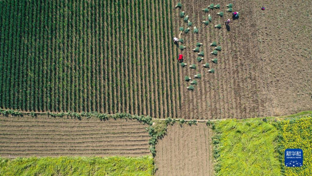 2月28日,在貴州省黔西南布依族苗族自治州興義市萬(wàn)福村,農民在田間勞作(無(wú)人機照片)。