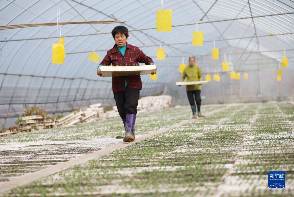 2月28日,在湖南省永州市道縣東門(mén)街道高車(chē)村育苗大棚,菜農在大棚里勞作。