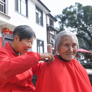 3月1日,昌化鎮“有禮昌化”流動(dòng)志愿服務(wù)站的志愿者在給白牛村95歲的村民方田英(右)上門(mén)理發(fā)。