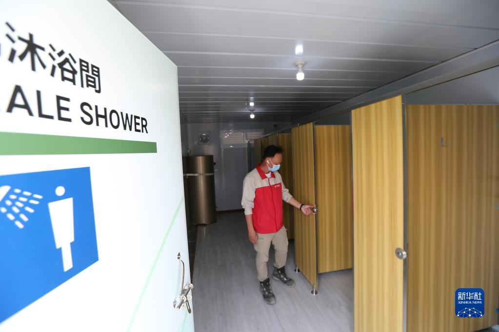 3月2日,工作人員查看中央援港青衣方艙醫院的淋浴房。