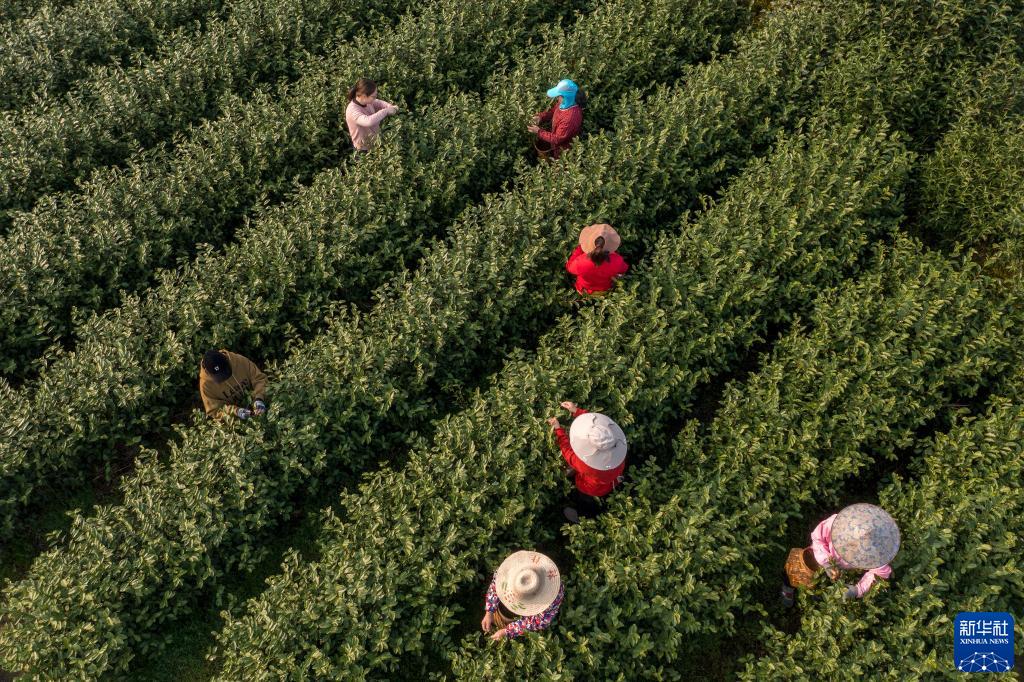 3月3日,村民在景寧縣鶴溪街道敕木山村茶園采茶(無(wú)人機照片)。