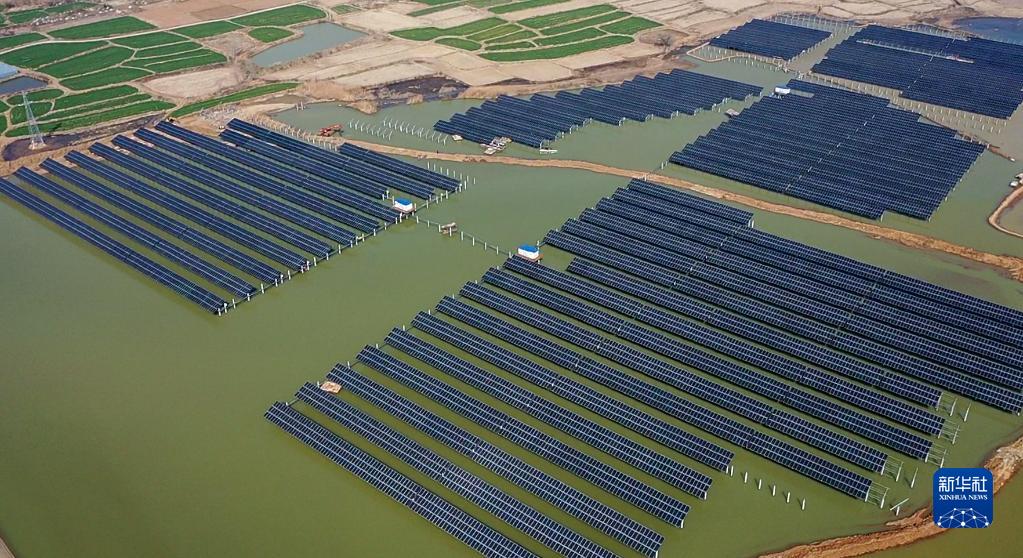 3月8日拍攝的施官鎮“漁光互補”光伏發(fā)電項目工程現場(chǎng)(無(wú)人機照片)。