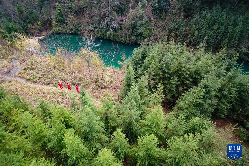 3月9日,護林員在貴州省黔東南苗族侗族自治州臺江縣南宮鎮的林區巡護(無(wú)人機照片)。