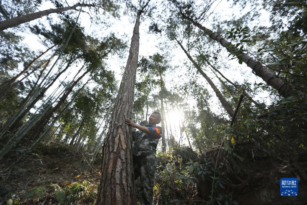 3月9日,在貴州省赤水市葫市鎮葫市村松林里,護林員陳應方在查看松樹(shù)長(cháng)勢。