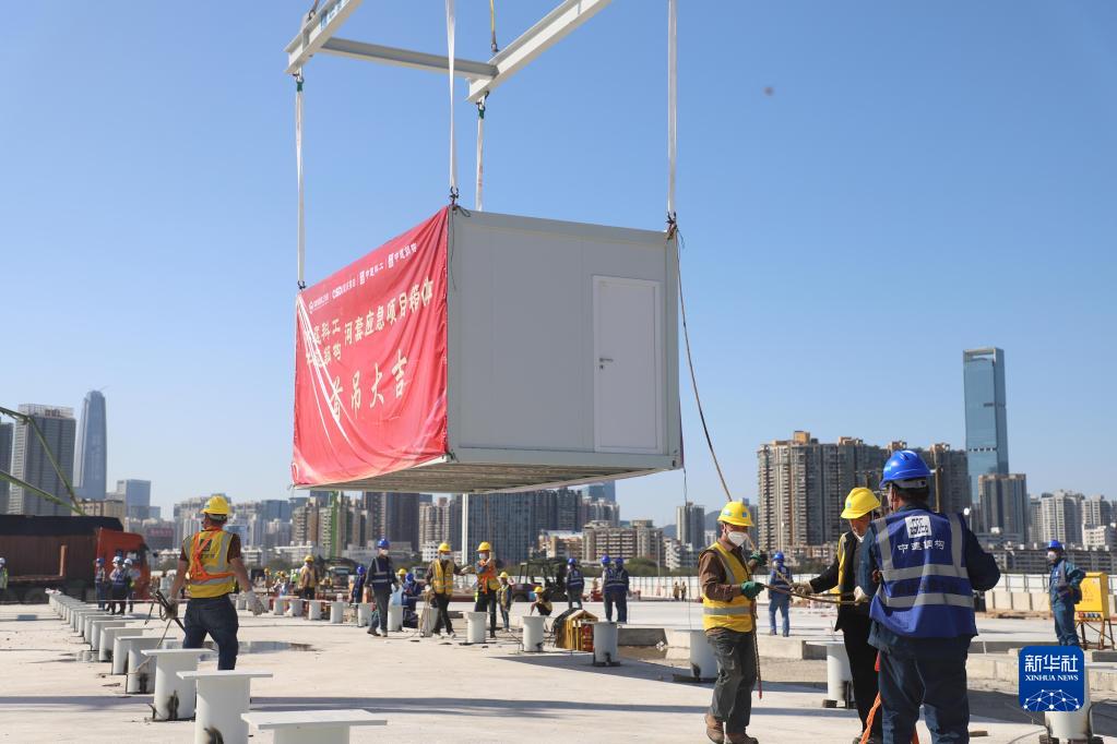 3月9日,中央援建香港應急醫院項目首個(gè)集成式箱體吊裝施工現場(chǎng)。