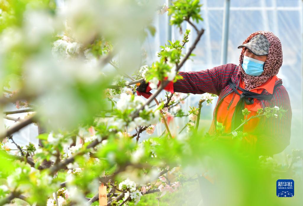 3月9日,在河北省石家莊市鹿泉區山尹村鎮的櫻桃種植基地,當地農民進(jìn)行櫻桃花授粉。