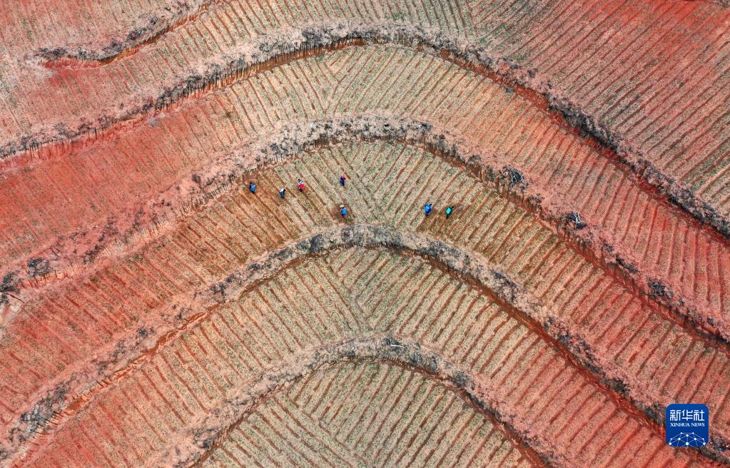 3月9日,村民在貴州省黔東南苗族侗族自治州丹寨縣興仁鎮擺泥村管護中藥材太子參(無(wú)人機照片)。