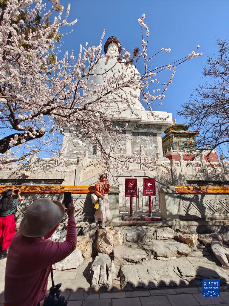 春暖大地,北京北海公園白塔旁的山桃花盛開(kāi),吸引不少游客前來(lái)欣賞。