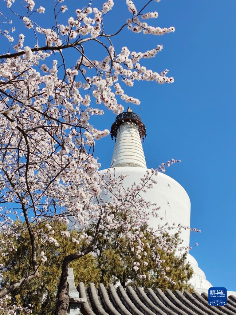 春暖大地,北京北海公園白塔旁的山桃花盛開(kāi),吸引不少游客前來(lái)欣賞。