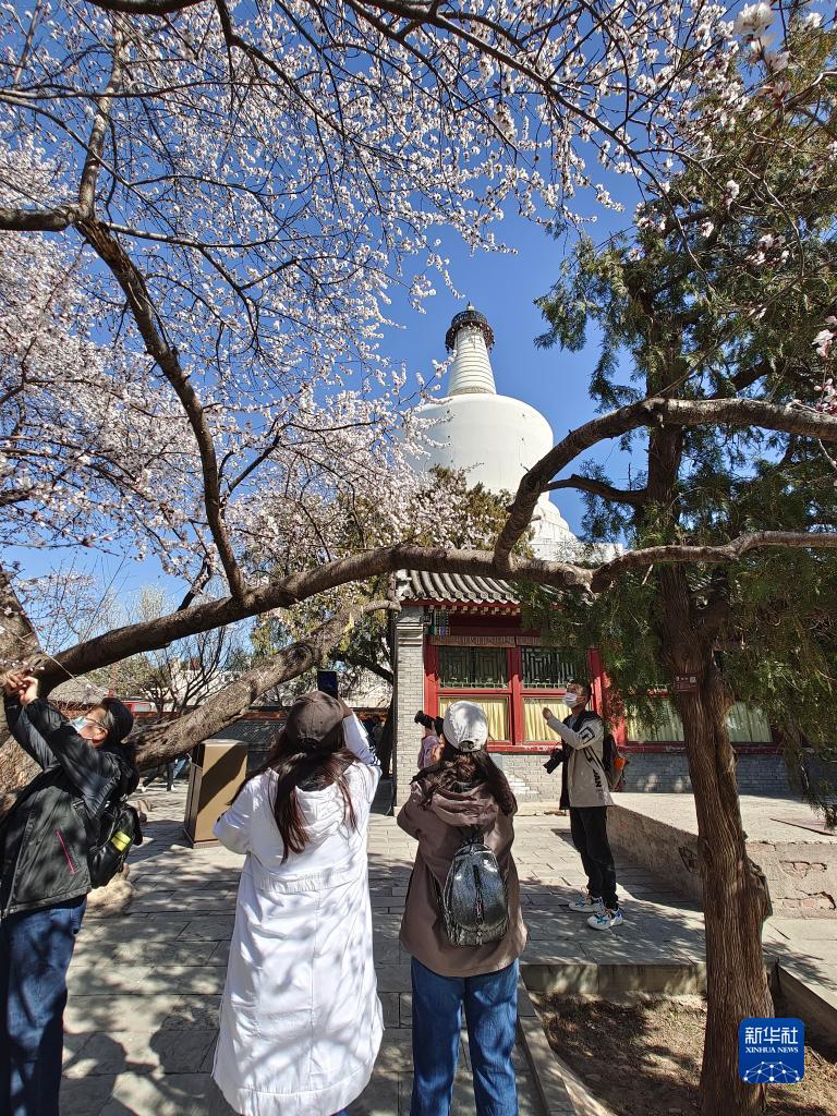 春暖大地,北京北海公園白塔旁的山桃花盛開(kāi),吸引不少游客前來(lái)欣賞。