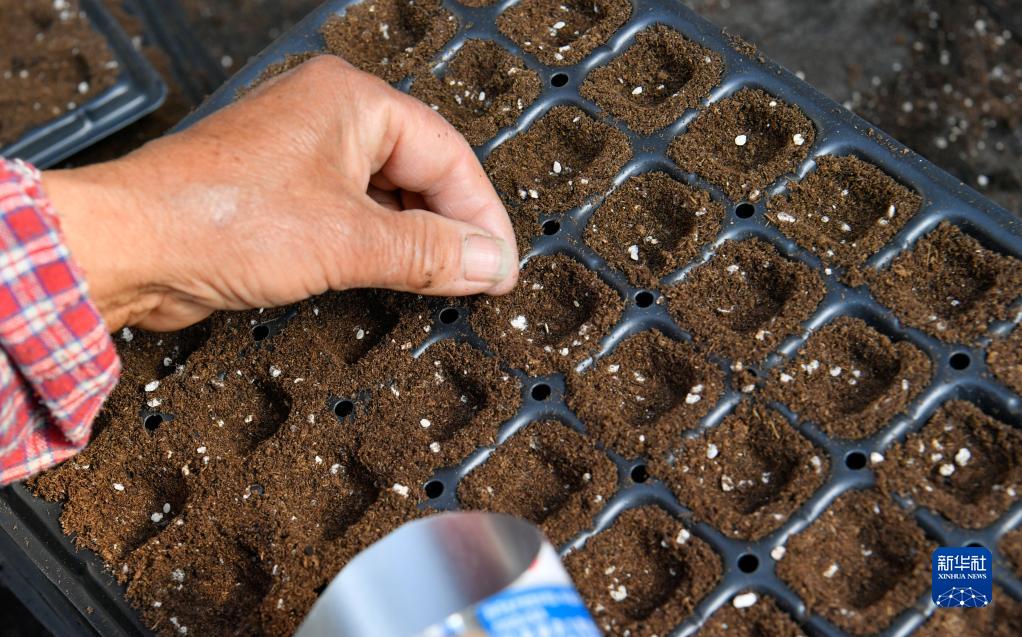 3月14日,在天津市寧河區苗莊鎮一家種苗培育基地,農民在穴盤(pán)里播種育苗。