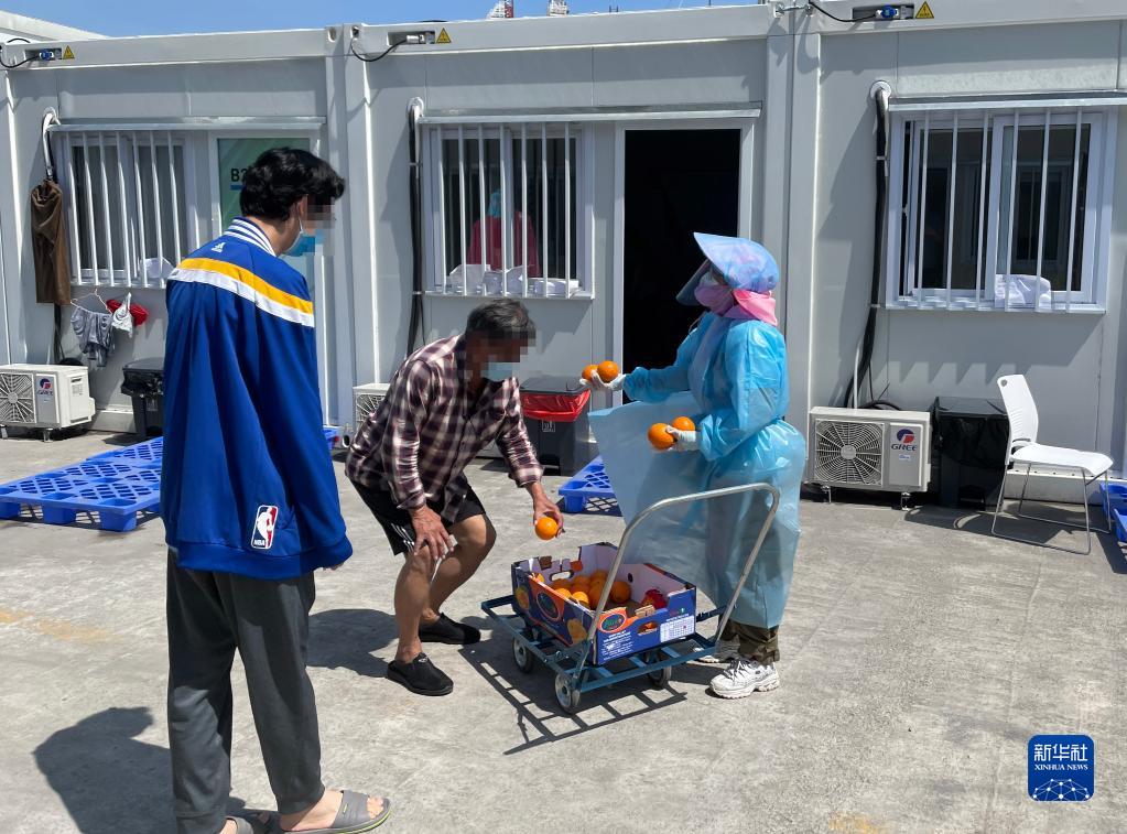 方艙醫院的工作人員給隔離人員配發(fā)水果(3月12日攝,手機照片)。