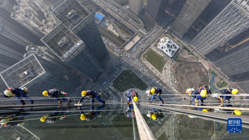 近日,高度335米的貴陽(yáng)國際貿易中心雙子塔迎來(lái)今年的首次清洗。8名“蜘蛛人”從塔巔垂直而下開(kāi)展高空作業(yè),將耗時(shí)20天左右才能完成清洗。
